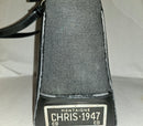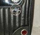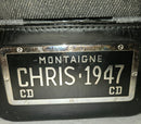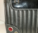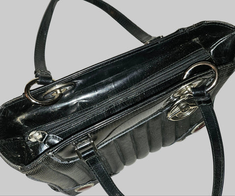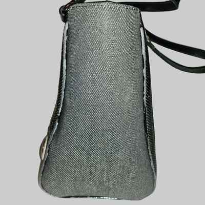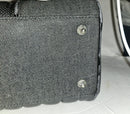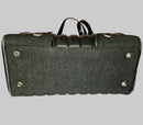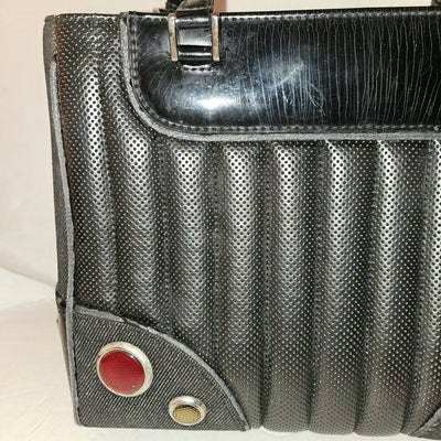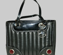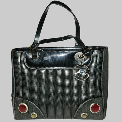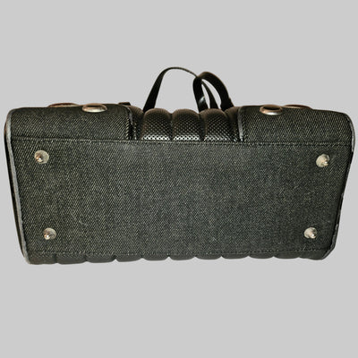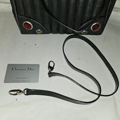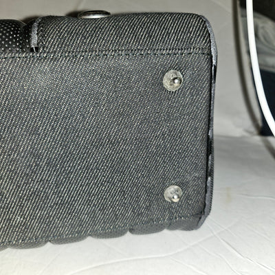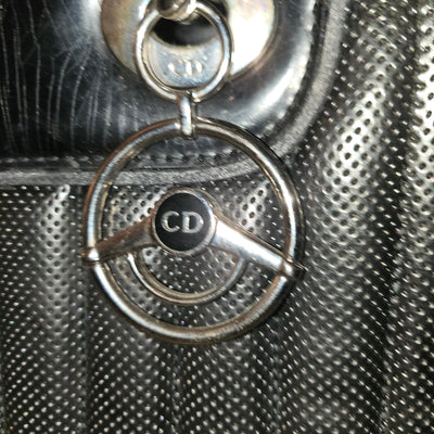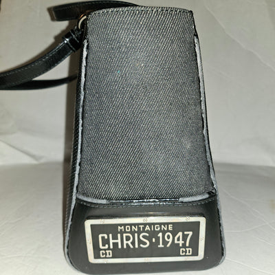 The purse is made in one of Dior's signature and most desirable styles! The bag is a medium/large, classic, satchel style purse with two handles, a top zip closure, and the look of a vintage car on the front with headlights and a hood ornament! It is made of a quilted black leather, black denim, and flat black leather handles & removable strap. All of the hardware is shiny chrome, signed as Dior, and there is a license plate on one side.