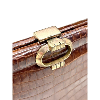 Step into timeless luxury with this exquisite 1960s Gucci brown crocodile leather top handle purse—a masterpiece of vintage Italian craftsmanship.