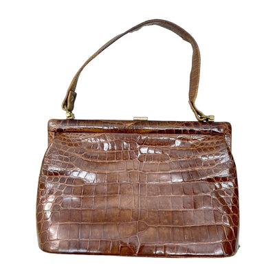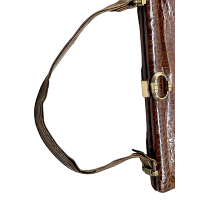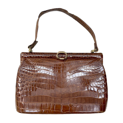 The rich, warm brown crocodile leather showcases authentic texture and patina that only genuine vintage pieces possess, while the iconic top handle design offers effortless elegance and practicality.