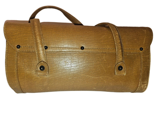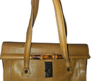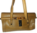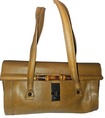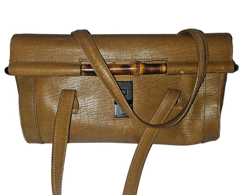 This is a fabulous, GUCCI, 'bullet bag' in brown leather! It is a shoulder bag with two shoulder straps! It is made of textured brown leather with a hard frame and cylinder shape. The bamboo accented top folds over the front to a black/gunmetal clasp that locks shut. It has brown leather interior and one main compartment and one zip pocket inside. Lots of room for everyday or special occasions