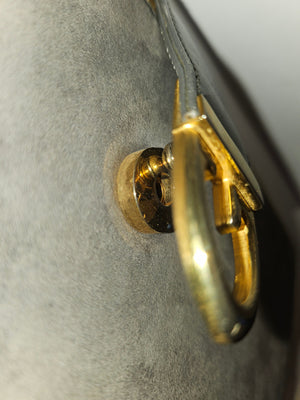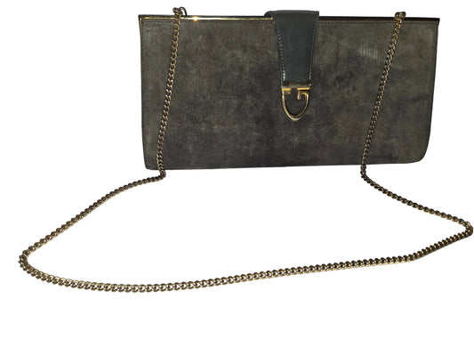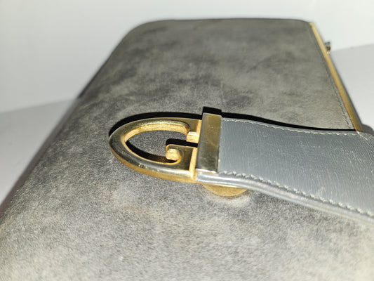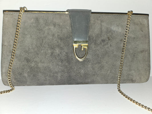 *For sale is a rare, 1960's, AMAZING, Gucci, mod, grey suede, hinged opening, two-way- clutch or shoulder bag style purse with a collapsible/removable gold chain strap, a sleek linear, gold lined top, and a bold G logo snap top clasp! This early vintage piece from Gucci is such an unusual purse with a modern, edgy style!