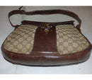 The bag is a saddle style, shoulder bag made of canvas fabric with a dark brown, large 'G' print on a brown body. It has a shoulder strap and a rounded bottom with an envelope flap top. It has matching brown leather framing the purse as the top, sides and bottom,, down the center, on the interior, and as the strap. In the center, it has gold tone 'G', equestrian, horse bit, locking clasp accent that match the side accents that attach the strap!