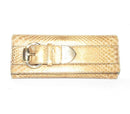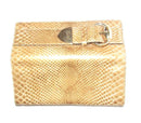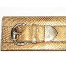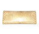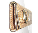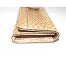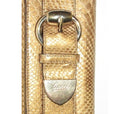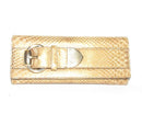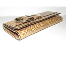 This purse is a rare style made with gold python skin leather! It is a long, rectangular shape with an envelope flap top. It has an extra large gold buckle accent, a gold arrowhead look accent engraved with 'Gucci' at the center, and a strip of python skin leather layered on top of the envelope top front!