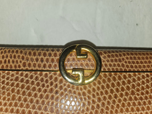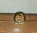 For sale is an authentic, rare, 1960's, AMAZING, Gucci tan lizard leather interlocking G pill box clutch style purse with a sleek linear, gold latch top clasp with an interlocking GG center accent! This early vintage piece from Gucci is such an unusual purse with a modern, edgy style!