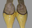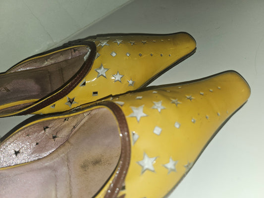 kitten heel mules in yellow, brown, & dark red with star cut outs